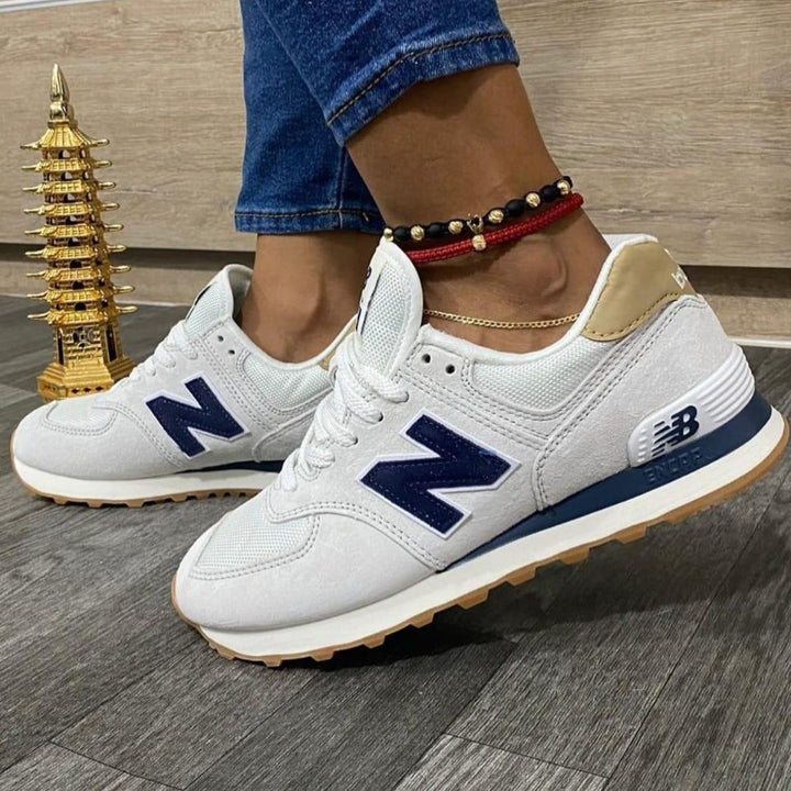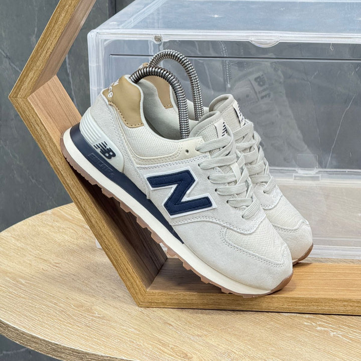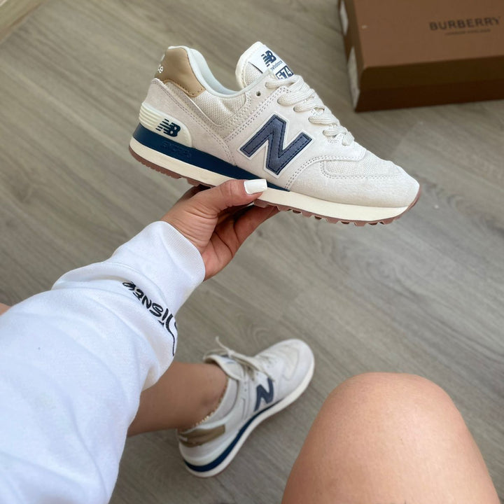 Las NB 574 han sido un referente en el mundo sneaker por su diseño atemporal, comodidad y versatilidad. Su combinación de tonos beige, azul marino y detalles dorados aporta un toque sofisticado a cualquier outfit.