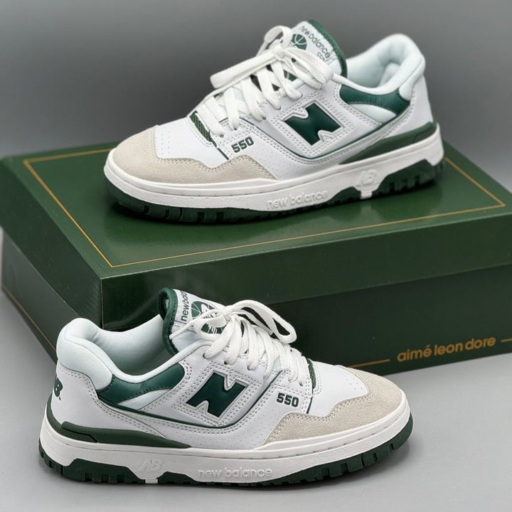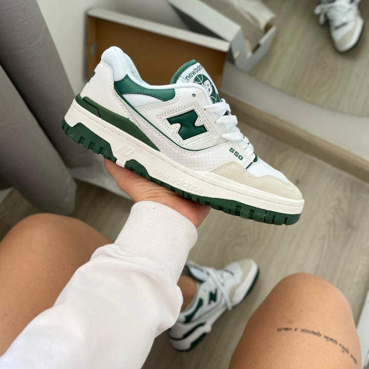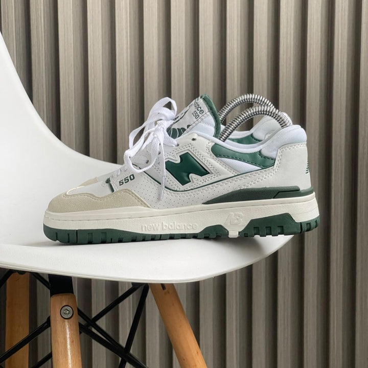 Descubre las NB 550, la zapatilla ideal que combina estilo clásico con detalles contemporáneos. Con una elegante mezcla de blanco, beige y toques en verde oscuro, este modelo aporta un aire fresco y sofisticado a cualquier look urbano. Perfectas para quienes desean destacar sin sacrificar comodidad en su día a día.