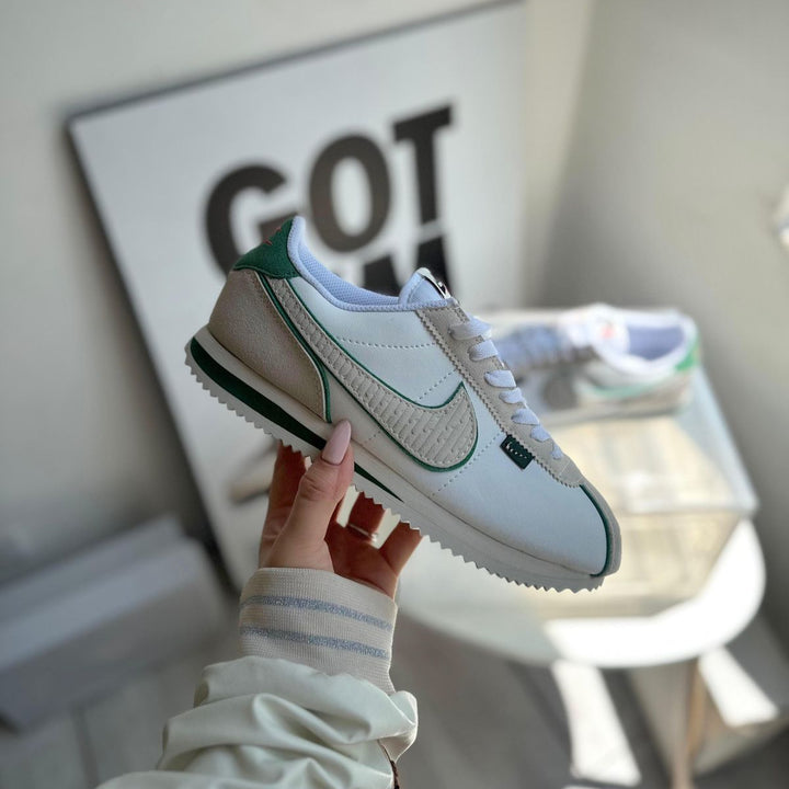 Las NK Cortez Retro reviven el espíritu del running vintage con un diseño elegante y materiales de primera calidad. Su combinación de colores en blanco, verde y gamuza las hace perfectas para quienes buscan un toque clásico en su outfit.